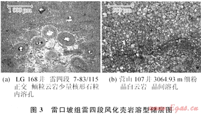 發(fā)育風(fēng)化殼巖溶型白云巖和顆粒白云巖2類儲(chǔ)層,前者見于盆地中部地區(qū),以LG雷四段為代表;后者發(fā)育于雷一段和雷三段,以中壩氣田最為典型[17],下面分別討論其特點(diǎn)。