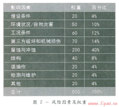 盡管危險辨識不能為風(fēng)險決策直接提供信息,但仍然是風(fēng)險分析的關(guān)鍵步驟。有時危險辨識分析能采用結(jié)構(gòu)技巧進(jìn)行分析,有時危險辨識則不是系統(tǒng)地進(jìn)行分析,而著重分析一些可能發(fā)生的危險。對于運(yùn)行期管道,主要對影響管道壽命和管道運(yùn)行安全的風(fēng)險進(jìn)行分析。