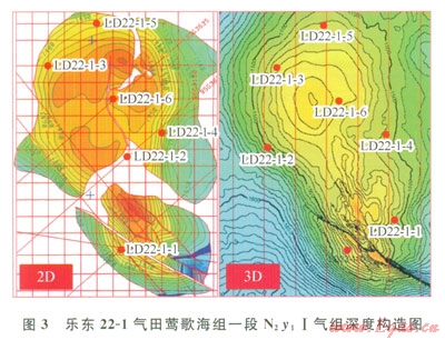 樂東22-l氣田三維地震解釋與二維解釋的構(gòu)造認識發(fā)生了較大變化,以N1y2Ⅰ,工氣組為例,原二維資料解釋存在“Y”形斷層,但在三維資料解釋后斷層并不存在(圖3)。另外,三維地震解釋后部分主力氣組的構(gòu)造高點和幅度也發(fā)生了明顯的變化。為了減少構(gòu)造對氣田開發(fā)的影響,進行了儲層精細描述,并以此來優(yōu)選井位和指導(dǎo)隨鉆井軌跡調(diào)整,為氣田開發(fā)成功實施奠定了基礎(chǔ)。