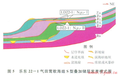 樂東22-1氣田主物源來自北東方向的海南島,為發(fā)育在陸架濱 淺海背景下,受沉積坡折控制的灘壩復(fù)合體沉積。儲層的形成,與海平面短期快速升降、強制性海退背景下形成的4級層序有關(guān)。4級層序界面以類工型界面為主,層序結(jié)構(gòu)主要表現(xiàn)為前積型特征,頂積層較薄(圖4)。S型疊加4級層序的頂積層可形成良好的儲集層,在沉積坡折以下多以淺海相泥巖、泥質(zhì)粉砂巖為主,儲層不發(fā)育(圖5)。準確把握層序形成機制和疊加樣式[7-8],可以有效地預(yù)測和把握有利儲層的分布,減少儲層預(yù)測上的失誤,降低風(fēng)險。通過對儲層的精細描述,刻畫有利砂體的展布,指導(dǎo)生產(chǎn)井的部署和井位優(yōu)化。