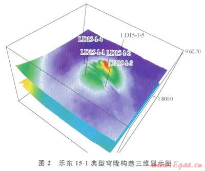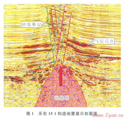 樂(lè)東l5-1構(gòu)造在發(fā)育過(guò)程中,由于底辟能量不足,導(dǎo)致本構(gòu)造為“未刺穿型”泥底辟構(gòu)造(圖1),構(gòu)造呈典型的穹隆背斜(圖2)形態(tài)。在背斜形成過(guò)程中,上覆地層發(fā)育了一系列張性斷層,這些斷層在剖面上呈“花”狀分布,平面上則以底辟為中心向四周呈放射狀展布(圖3)。斷層將樂(lè)東l5-1穹隆背斜分隔成多個(gè)斷塊,但各斷塊之間是否為獨(dú)立氣藏,開(kāi)發(fā)后是否會(huì)連通等問(wèn)題成為開(kāi)發(fā)井部署的難點(diǎn)。因此,如何準(zhǔn)確描述斷層,并在此基礎(chǔ)上制訂最優(yōu)化的開(kāi)發(fā)方案已成為樂(lè)東氣田開(kāi)發(fā)研究的重點(diǎn)。