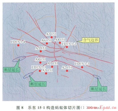螞蟻?zhàn)粉櫵惴ǖ膽?yīng)用優(yōu)勢(shì)在于可以快速、高效、自動(dòng)化解釋斷裂系統(tǒng)。但實(shí)際地震資料中,有很多非斷層因素引起的同相軸間斷,如儲(chǔ)層物性、流體變化、地層傾角和地震采集腳印等,在螞蟻體切片中都會(huì)出現(xiàn)明顯的斷層特征,而導(dǎo)致斷層的錯(cuò)誤解釋。為了減少斷層錯(cuò)誤解釋的概率,筆者在研究過(guò)程中對(duì)常規(guī)螞蟻?zhàn)粉櫻芯苛鞒踢M(jìn)行了改進(jìn)。工作中首先是對(duì)輸入地震資料進(jìn)行去噪、平滑等預(yù)處理,或原始資料特殊處理后的方差體數(shù)據(jù)體進(jìn)行去噪處理,再開(kāi)展螞蟻?zhàn)粉櫶幚?,然后在穹隆背斜形成過(guò)程的應(yīng)力指導(dǎo)下進(jìn)行斷層、微斷層的識(shí)別和解釋。圖8為研究所獲得的螞蟻體切片,從圖8中可見(jiàn)常規(guī)手段解釋斷層的延長(zhǎng)線方向的微、小斷層清晰可辨,解釋不確定性大幅降低。