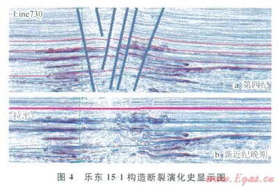 樂(lè)東l5-1構(gòu)造底辟的活動(dòng)[8]分為兩個(gè)期次,導(dǎo)致斷層的發(fā)育也分為兩個(gè)期次。第一個(gè)活動(dòng)期次是在新近系晚期,在第四紀(jì)前結(jié)束;因此,受本期底辟活動(dòng)影響而發(fā)育的斷層組在新近紀(jì)以后也基本停止活動(dòng)(圖4-b),該組斷層走向近似南北向(圖3);到第四紀(jì)早期,底辟活動(dòng)加劇,發(fā)育更多斷層且斷距較之前發(fā)育的斷層增大(圖4-a);第四紀(jì)中晚期以后,泥底辟活動(dòng)漸趨減弱或停滯,斷層活動(dòng)也基本停止。第四紀(jì)發(fā)育的斷層以穹隆背斜的中心為圓點(diǎn),向四周放射狀分布,且均為正斷層。南北向的斷層由于形成時(shí)間相對(duì)較早,被后期近東西向的斷層切割。
