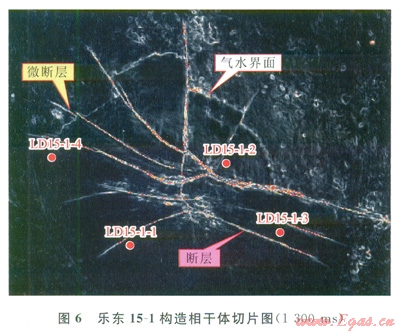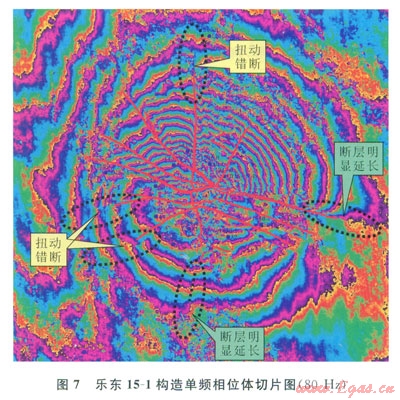 圖7是樂(lè)東l5-1氣田80Hz單頻相位體切片,圖中可以看到,原地震剖面所識(shí)別斷層延長(zhǎng)線上,相位資料還明顯發(fā)生扭動(dòng)或錯(cuò)斷,因此可解釋出常規(guī)資料和方法無(wú)法識(shí)別的微、小斷距的斷層,使得原有多條斷層的解釋方案向外延伸,致背斜構(gòu)造北部的平面分塊更可靠,背斜的南部也在橫向上分成了4~5個(gè)斷塊,合理的解釋了構(gòu)造南部各井氣體組分差異的原因。