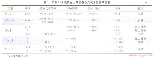 由于含氣砂巖明顯的低速特征,在模糊區(qū)之外氣層的亮點或極性反轉等都非常清楚(圖5)。在南區(qū)可以看到氣層的平點特征,而薄層一般可見明顯的極性反轉現(xiàn)象。實鉆資料和壓力推算證實,這一地震信息是可以確定各氣藏的含氣范圍的。如Ql1V上氣組的氣水界面,壓力推測為-573m,亮點為-575m,實鉆為-570.8m,基本一致(表2);另外,利用試井分析結果明確斷層位置,確定合理含氣范圍。如N2y1I氣組6井區(qū)和3、5井區(qū)兩個單元經(jīng)井證實氣水界面和氣體組分均有差異,但由于模糊區(qū)的存在,兩個井區(qū)之間疑似有一條走向近南北的斷層,通過2、6井的試井解釋,均顯示有不滲透邊界的存在,證實了“模糊區(qū)”內(nèi)F4斷層的存在,為合理確定這兩個計算單元的含氣范圍提供了依據(jù)。