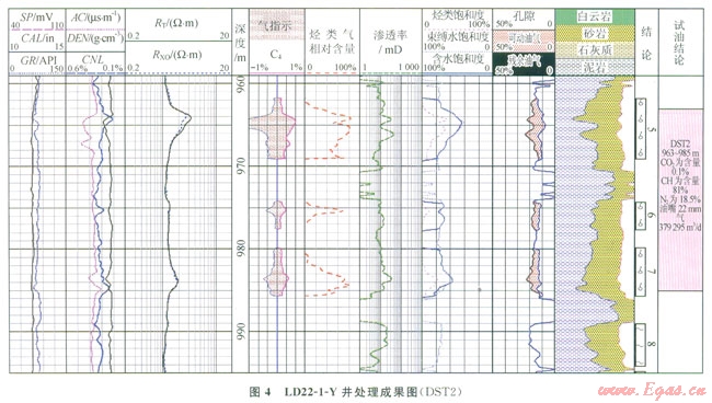 圖4顯示LD22-1-Y井963~985m段測(cè)井定量計(jì)算烴類氣含量為75%左右,測(cè)試證實(shí)該層甲烷含量為81%。通過鶯歌海盆地l5口井19個(gè)層位測(cè)井計(jì)算烴類氣含量與實(shí)測(cè)結(jié)果對(duì)比,在統(tǒng)計(jì)的l9層中,絕對(duì)誤差在20%以內(nèi)的層有l5層,占79%;絕對(duì)誤差在10%以內(nèi)的層有l2層,占63%[13]。表明該定量方法能較為有效地計(jì)算烴類氣含量,從而達(dá)到區(qū)分烴類氣與非烴氣的目的。