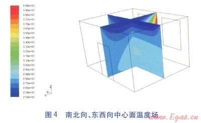 由于室內溫度場是三維場,因此選取其中最有代表性的3個切面進行分析:南北向及東西向的中心面、人員工作區(qū)距地面1.5m的平面。南北向中心面溫度場見圖3,南北向、東兩向中心面溫度場見圖4,1.5m高度處溫度場見圖5。