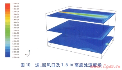 送回風口中心面溫度場見圖6,南北向、東西向中心面溫度場見圖7。送回風口立面、南北向中心面速度場見圖8,東西向中心面速度場見圖9,送、回風口及1.5m高度處速度場見圖l0。由圖6、7可知,采用新風除濕輔助毛細管輻射供冷系統(tǒng)的房間,室內溫度在舒適范圍內,垂直方向溫度梯度小,舒適性更強。由圖8~10可知,工作區(qū)內風速在0.3m/s左右,無吹風感。