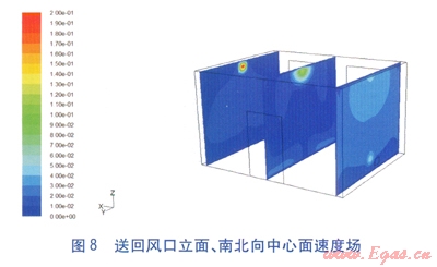 由圖3、4可知,靠近頂面的空氣溫度較低,且垂直方向溫度梯度較大,而距地面l.5m范圍內的垂直方向溫度梯度較小。由圖3、5可知,靠近外窗的空氣溫度較高,但水平方向上的溫度梯度并不大。