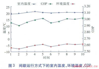 連續(xù)運行方式的實驗時間為l個月,每天運行24h,每小時監(jiān)測記錄一次。以每3天為單位取室內(nèi)溫度、COP、環(huán)境溫度平均值,結(jié)果見圖2。其中橫坐標值1代表實驗的第l~3天,2代表實驗的4~6天,依此類推。在此運行模式期間,平均室外溫度為-3.47℃,最低日平均溫度為-6.6℃,最高日平均溫度為0.0℃,太陽輻射平均日總量為2353W/m2,集熱器平均日集熱總量為l411.8W/m2,室內(nèi)溫度在19.2~22.7℃范圍內(nèi)變化(平均達21.15℃),系統(tǒng)的平均COP達2.689,COP最低為2.614,最高為2.782。從圖2可知,系統(tǒng)連續(xù)運行時的供暖溫度始終在人體舒適的溫度范圍內(nèi)波動,但是系統(tǒng)的COP值較小,說明能耗還可以進一步降低。