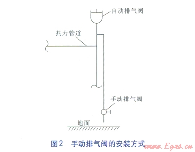 在原有自動排氣閥的基礎(chǔ)上,增設(shè)一個手動排氣閥,具體安裝方式見圖2。在自動排氣閥前的排氣管引出一根支管至地面附近,在支管末端安裝一個手動排氣閥。在換熱機組啟動前,運行人員打開手動排氣閥,快速排除管道內(nèi)的不凝性氣體,直至供回水壓力穩(wěn)定且僅有水而無氣體排出時,再關(guān)閉手動排氣閥。此后,可完全依靠自動排氣閥排氣,這樣即可確保換熱機組的安全穩(wěn)定運行。