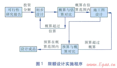限額設(shè)計(jì)是按照批準(zhǔn)的可行性研究報(bào)告和投資估算控制初步設(shè)計(jì),按照批準(zhǔn)的初步設(shè)計(jì)總概算控制施工圖設(shè)計(jì),保證總概算不被突破。限額設(shè)計(jì)實(shí)施程序見(jiàn)圖1。