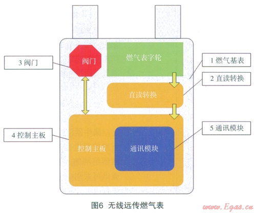 無(wú)線遠(yuǎn)傳燃?xì)獗硎窃谄胀矣闷つと細(xì)獗砩霞友b光電直讀計(jì)數(shù)器、電子控制模塊、無(wú)線通訊模塊等電子模塊組成的,如圖6所示,無(wú)線遠(yuǎn)傳燃?xì)獗戆惭b在用戶家中,燃?xì)夤疽詿o(wú)線手持機(jī)或者采集器為無(wú)線數(shù)據(jù)傳輸媒介,對(duì)燃?xì)獗韺?shí)行戶外實(shí)時(shí)抄表和遠(yuǎn)程閥門控制。主要功能包括以下幾點(diǎn):