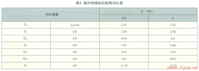 同時(shí)由圖4可以看出,隨著Pn的降低,原料氣的液化曲線(xiàn)不斷下移,而且愈加不平滑,由圖5~圖8可見(jiàn)換熱器(LNGl02)最小換熱溫差逐漸變小,當(dāng)壓力降至4.0MPa時(shí)最小溫差變?yōu)樨?fù)值,換熱器(LNGl02)無(wú)法收斂。此外由于換熱溫差減小,導(dǎo)致LNG換熱器的UA值不斷增大。對(duì)于已建工廠,由于換熱器的體積一定,且換熱器內(nèi)流體的流動(dòng)狀態(tài)、各項(xiàng)物性參數(shù)也不會(huì)發(fā)生太大變化,因此其UA值也基本是一個(gè)定值,因此此時(shí)若不對(duì)制冷劑組分進(jìn)行調(diào)整,則需增加制冷劑的循環(huán)量。在保證LNGl02換熱器UA基本不變的情況下增加制冷劑循環(huán)量處理每kmol原料氣的計(jì)算數(shù)據(jù)見(jiàn)表4。