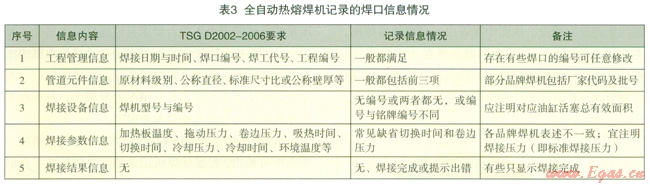 表3是目前全自動(dòng)型熱熔焊機(jī)焊口信息記錄情況。從表中可看出,大部分焊機(jī)記錄的焊口信息既存在信息不齊全的問題,義存在術(shù)語表述不符合同家安全技術(shù)規(guī)范[13]的不足。常見缺省的內(nèi)容包括焊接設(shè)備信息和焊接參數(shù)信息。然而,對于焊口質(zhì)量管理來說,只有焊口信息完備且具有可追溯性才具有真正的意義。
