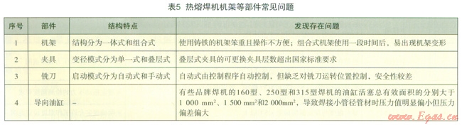 表5為檢測中常見的熱熔焊機(jī)機(jī)架、夾具、銑刀和導(dǎo)向油缸等部件存在的問題。從表中可以看出,出現(xiàn)的問題主要與制造廠家的設(shè)計(jì)和使用材料有關(guān)。