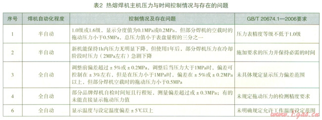 表2是檢測結(jié)果中常見的熱熔焊機(jī)主機(jī)的控制壓力和溫度性能中存在的問題。從表中可看出不少半自動(dòng)型焊機(jī)的壓力表精度等級明顯低于同家標(biāo)準(zhǔn)[12]要求,并且存在保壓能力不足的問題。這表明焊機(jī)的控壓系統(tǒng)元件的等級不符合要求且性能易發(fā)生劣化。對于全自型焊機(jī),由于國家標(biāo)準(zhǔn)對全自動(dòng)熱熔焊機(jī)的壓力控制精度和工作溫度控制精度缺乏明確的規(guī)定,大部分焊機(jī)的壓力和溫度控制情況差異很大,且存在不少焊機(jī)的壓力與溫度控制偏差很大。