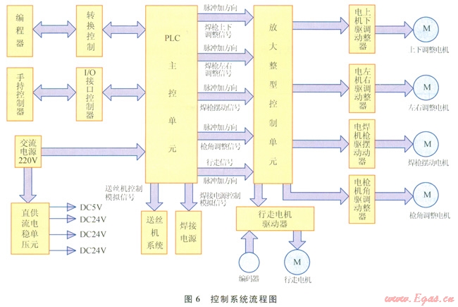 通過手持控制器可選擇具體的焊接工序及各種控制按鈕,經(jīng)I/O總線進行控制命令的發(fā)送(圖6)。所有焊接參數(shù)均寫入編程器中,并通過轉換控制單元傳輸。信號最終傳輸給PLC主控單元進行處理,經(jīng)放大給整形單元整形后傳輸給各電機驅動器,進而對相應電機進行運動控制。