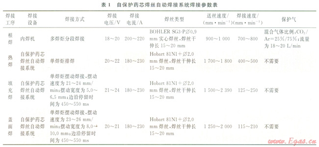 自保藥芯焊絲自動焊接系統(tǒng)的焊接參數(shù)見表1。