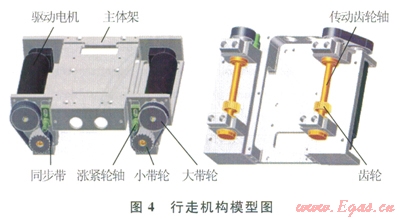 行走機構主要由行走驅動電機、大帶輪、小帶輪、同步帶、漲緊輪軸、主體架、傳動齒輪軸、齒輪等組成(圖4)。