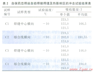 試驗證明,白保藥芯焊絲自動焊接過程平穩(wěn),焊縫成形好,焊接接頭的抗拉強度、側彎性能、硬度值、沖擊功等力學性能均滿足X80管線鋼的焊接標準要求。其焊縫及熱影響區(qū)的沖擊試驗結果見表2。同時,自保藥芯焊絲自動焊接可進一步降低焊工的勞動強度,有效規(guī)避焊接施工中氣體供給帶來的不便,可降低管道焊接綜合成本。
