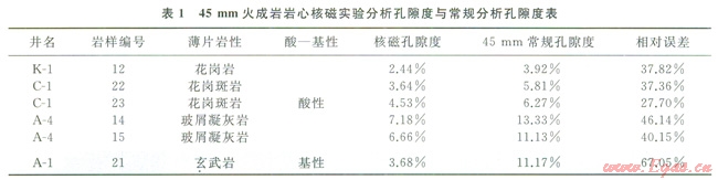 6塊巖心核磁實(shí)驗(yàn)孔隙度與常規(guī)分析孔隙度對(duì)比看出,火成巖核磁實(shí)驗(yàn)孔隙度明顯低于常規(guī)分析的孔隙度(1),并且基性巖(21號(hào)巖樣)減小的程度要明顯的大于酸性巖(如表l中的12、22、23號(hào)巖樣)。這是因?yàn)?,基性玄武巖的磁化率高,孔隙內(nèi)部梯度磁場(chǎng)強(qiáng),核磁信號(hào)衰減幅度大。