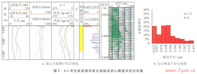 536413645m段核磁孔隙度與常規(guī)巖心孔隙度之間的誤差要明顯的大于3636364lm(5-a),這是因?yàn)?span lang="EN-US">36413645m段的巖心孔喉半徑要明顯的小于36363641m段。