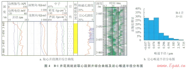 從孔喉大小看,圖5所示的基性玄武巖的孔喉半徑(5-b)要明顯的大于酸性花崗斑巖(4-b)?;孕鋷r孔喉半徑大于0.148mm的孔喉體積要明顯的大于酸性花崗斑巖,孔喉半徑大于0.148mm的孔喉體積兩口井分別是48%和l8.2%,孔喉半徑大小差異明顯。