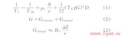 式中T2B為體積弛豫,msD為擴(kuò)散系數(shù),cm2sG為觀測(cè)時(shí)的梯度磁場(chǎng);g為旋磁比;TE為回波間隔;r2為橫向表面弛豫強(qiáng)度;SV為巖石比表面;B0為外加磁場(chǎng)強(qiáng)度;r為磁場(chǎng)變化的距離;Dc為巖石骨架顆粒與孔隙流體之間磁化率的差。