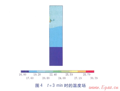 通過有限元軟件模擬了管道氣密性試驗(yàn)過程24h內(nèi)的溫度場分布,不同時(shí)刻的溫度場分布見圖3~8,t為模擬的時(shí)間,云圖下方彩色標(biāo)尺的顏色深淺表示溫度的高低,數(shù)值表示溫度值,單位為℃。