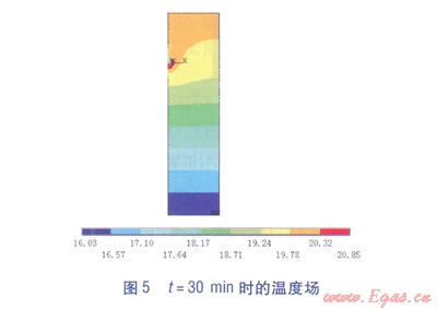①運(yùn)用有限元軟件ANSYS的熱分析功能,模擬得到了埋地管道氣密性試驗(yàn)過程中溫度場隨時(shí)間的變化情況:試驗(yàn)開始階段,管道溫度下降較快,30min后,管道溫度下降速度減緩,經(jīng)過1.5h后,管內(nèi)外溫度場基本達(dá)到穩(wěn)定。