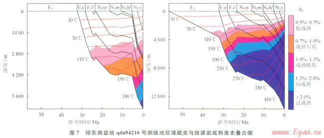 盆地的構(gòu)造沉降與埋藏史不同也導(dǎo)致成熱度演化軌跡的不同,快速的沉降與埋藏往往會(huì)對(duì)應(yīng)烴源巖的快速增熟和熱演化程度的升高。圖7為瓊東南盆地94216號(hào)測(cè)線的地層埋藏史與烴源巖成熟度史模擬疊合圖,2個(gè)人工井點(diǎn)分別位于凹陷邊緣與凹陷中央??梢钥闯觯貉鲁墙M存在2期快速沉降與Ⅰ期緩慢沉降階段,同時(shí)對(duì)應(yīng)2期烴源巖的快速增熟與Ⅰ期緩慢增熟過(guò)程。早期的快速沉降發(fā)生在32.0~23.3Ma為盆地裂陷期快速拉張階段,此階段雖然發(fā)生了烴源巖的快速增熟,但凹陷邊緣烴源巖的熱演化程度尚很低,剛剛或尚未進(jìn)入生油窗,凹陷中央早期演化樣度偏低,但晚期可進(jìn)入生氣窗;第2期的快速沉降發(fā)生于5.4Ma以來(lái),盆地受紅河斷裂帶構(gòu)造體制轉(zhuǎn)換的影響加速沉降,沉積了巨厚的鶯歌海組,導(dǎo)致崖城組烴源巖熱演化程度迅速增高,達(dá)到高成熟過(guò)成熟階段。
