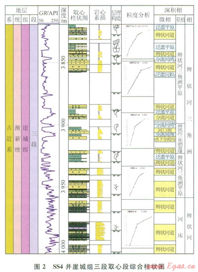 與同處于南海北部的珠江口盆地不同,瓊東南盆地缺少類似古珠江流域這樣的大河來(lái)為盆地提供巨厚的沉積物,因此,盆地內(nèi)物源相對(duì)不充分,較明顯的為來(lái)自盆地西北部的三亞河和東北部的萬(wàn)泉河,帶來(lái)了一定的物源供給,形成了相對(duì)較厚的三角洲沉積。以鉆遇三亞河三角洲的SS4井為例(圖2,圖3-a、3-b),該井主要為灰白色、淺灰色礫巖、砂礫巖、粗砂巖、中砂巖夾薄層灰色碳質(zhì)泥巖,礫巖呈次棱角狀—次圓狀,分選差—中等,礫石直徑可達(dá)4cm,多次見(jiàn)沖刷面與滯留沉積,正韻律發(fā)育,沉積現(xiàn)象豐富(如槽狀交錯(cuò)層理、平行層理、波狀層理、變形層理、生物擾動(dòng)構(gòu)造、見(jiàn)炭化的植物莖),總體為辮狀河三角洲平原至前緣的沉積。砂巖粒度概率曲線有三段式與兩段式2種,分別代表了辮狀河道與水下分流河道沉積。顯微鏡下看以中粒長(zhǎng)石石英砂巖、粗粒長(zhǎng)石巖屑砂巖、長(zhǎng)石雜砂巖等為主,富含云母、長(zhǎng)石等不穩(wěn)定礦物,成熟度較低,反映較近源沉積環(huán)境。GR測(cè)井曲線上,下部表現(xiàn)為齒化鐘形,上部表現(xiàn)為大幅度微齒化箱形、鐘形、漏斗形,且以箱形為主,反映下部水動(dòng)力頻繁活動(dòng)。上部相對(duì)較穩(wěn)定。測(cè)井解釋煤層8層,總厚度為3.56m,主要的成煤環(huán)境為辮狀河三角洲平原。該井崖三段早期植物角質(zhì)豐度大,指示陸相環(huán)境,而晚期有孔蟲、海相溝鞭藻呈不連續(xù)但高濃度分布,表明該部位受到海侵影響。