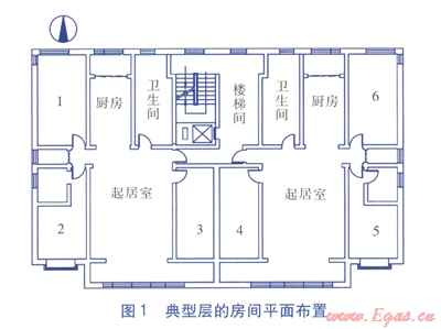 以天津市某住宅小區(qū)建筑為例,該建筑為一梯兩戶的l5層板樓,層高為3m。典型層的房間平面布置見圖1,東側(cè)住戶建筑面積為l33.03m2,西側(cè)住戶建筑面積為132.07m2。各房間及外窗尺寸見表1,圍護(hù)結(jié)構(gòu)熱工性能參數(shù)見表2。