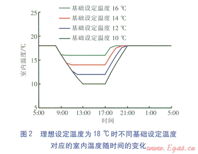 由圖6可知,在理想設(shè)定溫度為20℃、基礎(chǔ)設(shè)定溫度為l4℃條件下,房間3、5在人員外出的時(shí)間內(nèi),室內(nèi)溫度未能降至l4℃。尤其是位于建筑內(nèi)部的房間3,17:00室內(nèi)溫度僅降低至l8℃。對于這種房間,基礎(chǔ)設(shè)定溫度無淪是小于還是等于18℃,產(chǎn)生的效果相近。相對于房間1,房間3、5的室內(nèi)溫度下降時(shí)間較長,溫度回升時(shí)間較短。