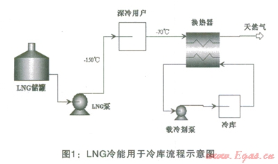 圖l為LNG冷能用于冷庫(kù)技術(shù)的流程示意圖。儲(chǔ)罐中-162℃的LNG經(jīng)泵加壓到天然氣高壓輸氣管網(wǎng)所需的壓力,溫度上升至約-150℃,由于LNG溫度液化天然氣;冷能;冷媒;冷庫(kù);能量轉(zhuǎn)換;經(jīng)濟(jì)性非常低,冷能的品位非常高,故可用于一些深冷用戶,如廢舊輪胎的深冷粉碎、二氧化碳制干冰等。LNG的冷能通過(guò)深冷用戶的一次利用后,溫度從-150℃上升到約-70℃左右,LNG全部汽化成為低溫的高壓天然氣。