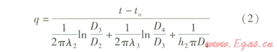 架空敷設(shè)熱水供熱管道(以下簡(jiǎn)稱架空管道,由工作鋼管、保溫層、保護(hù)層構(gòu)成)傳熱模型見(jiàn)圖l,單位長(zhǎng)度架空管道熱損失q的計(jì)算式為[1]:
