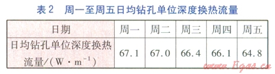 連續(xù)運行工況下,周一至周五地埋管換熱器連續(xù)運行時間鉆孔單位深度換熱流量隨時間的變化見圖2。由圖2可知,隨著時間推移,鉆孔單位深度換熱流量整體呈下降趨勢,雖然周一二這種變化并不明顯,但從周三開始,特別是周五,地埋管換熱器的換熱能力已有明顯降低。前一日運行結束時的鉆孔單位深度換熱流量較低,但次日基本能恢復至前一日開始運行時的水平。周一至周五日均鉆孔單位深度換熱流量見表2。由表2可知,經過5d的連續(xù)運行,鉆孔單位深度換熱流量從67.1W/m下降至64.8W/m,下降幅度為3.4%。