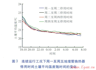 連續(xù)運行工況下周一至周五地埋管換熱器停用時間土壤平均溫度隨時間的變化見圖3。由圖3可知,土壤溫度的恢復是一個由快變慢的過程。在地埋管換熱器停用后,前4h土壤平均溫度快速下降,之后下降幅度明顯變緩。由于連續(xù)運行,土壤平均溫度整體上有逐漸升高的趨勢。由實測結果可知,從周五地埋管換熱器停用到下一周運行開始,土壤經過62h的恢復,土壤平均溫度從23.0℃下降至20.2℃,為下一周的運行提供了有利條件。