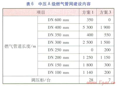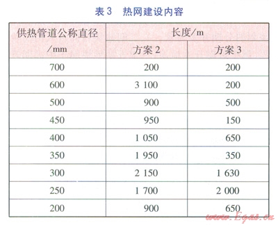 方案l~3各分項(xiàng)工程建設(shè)內(nèi)容分別見(jiàn)表2~6。表3中的熱網(wǎng)指一級(jí)管網(wǎng),由于二級(jí)管網(wǎng)(包括分散式低溫燃?xì)忮仩t房至熱用戶的管網(wǎng))造價(jià)由用戶分?jǐn)?,因此不?jì)入熱網(wǎng)造價(jià)中。由表2~6可計(jì)算得出方案l~3的工程造價(jià)分別為35237.74×104、43004.35×104、41047.11×104元。