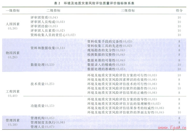 專家組根據(jù)環(huán)境及地質(zhì)災(zāi)害專項(xiàng)風(fēng)險(xiǎn)評(píng)價(jià)的特點(diǎn),在圖2所示質(zhì)量評(píng)價(jià)體系結(jié)構(gòu)的基礎(chǔ)上制訂出一套有針對(duì)性的質(zhì)量評(píng)價(jià)指標(biāo)體系(2),其中括號(hào)內(nèi)為各指標(biāo)權(quán)重值。