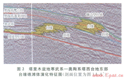 地震資料揭示了塔里木盆地塔西臺地寒武奧陶紀碳酸鹽巖臺地臺緣礁灘的演化過程(圖2)。塔西臺地東部在早寒武世早期表現(xiàn)為碳酸鹽緩坡[3],并在早寒武世中期(肖爾布拉克組沉積期)過渡為鑲邊臺地。早寒武世中期—晚寒武世,臺緣帶以加積—進積的方式生長,厚度超過l500m,進積距離在塔中—古城地區(qū)最大,可達80km。寒武紀末,海平面下降造成臺地暴露,結(jié)束了臺地生長過程,臺緣帶頂部見有明顯的削截現(xiàn)象。奧陶紀,隨著海平面的再次上升,逐漸形成了第二個生命周期的碳酸鹽巖臺地建造。奧陶紀塔西臺地東緣主要以加積的方式生長,臺緣礁灘的厚度超過1200。
