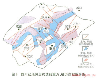 為了深入探討四川盆地基底結(jié)構(gòu)特征,中國(guó)石油勘探開(kāi)發(fā)研究院與成都理工大學(xué)合作(2009年),對(duì)四川盆地重磁數(shù)據(jù)進(jìn)行重新處理,采用的技術(shù)包括基于多層異常分離的切割法、任意深度視強(qiáng)度反演技術(shù)、3D物性界面深度反演技術(shù)等。重力、磁力研究成果與深層地震反射信息相結(jié)合,不僅對(duì)識(shí)別基底巖性分區(qū)、基底斷裂等基底構(gòu)造分析,而且對(duì)震旦系之下的沉積巖層研究提供了重要資料基礎(chǔ)。限于篇幅,下文重點(diǎn)討論根據(jù)地球物理信息識(shí)別盆地腹部前震旦系構(gòu)造特征。