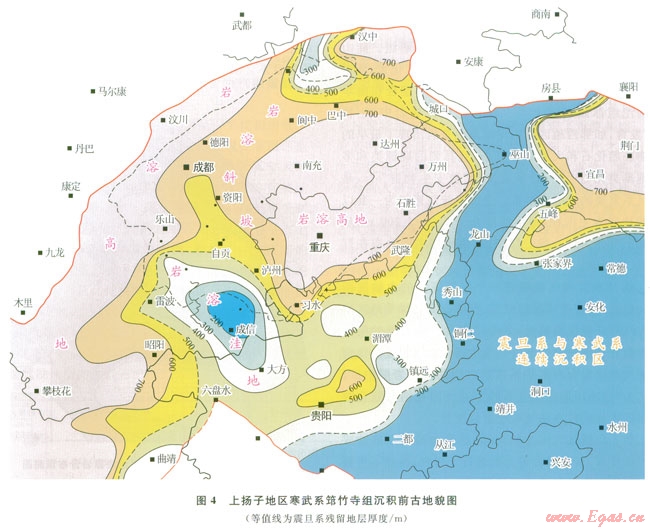 近期研究表明,上揚(yáng)子地區(qū)在震旦紀(jì)—早寒武世早期發(fā)生了3幕桐灣運(yùn)動(dòng)。桐灣運(yùn)動(dòng)Ⅰ幕發(fā)生在燈二段末期,Ⅱ幕發(fā)生在燈影組末期,Ⅲ幕發(fā)生在梅樹(shù)村末期。運(yùn)動(dòng)性質(zhì)均表現(xiàn)為整體抬升。受其影響,燈二段、燈四段形成了兩套風(fēng)化殼型巖溶儲(chǔ)層。露頭及鉆井資料證實(shí),兩套巖溶儲(chǔ)層不僅在威遠(yuǎn)、磨溪、高石梯等古隆起區(qū)發(fā)育,而且在貴州仁懷的桐梓剖面、凱里的基東剖面以及鄂西地區(qū)的利l井等,均可見(jiàn)風(fēng)化殼型巖溶儲(chǔ)層。把現(xiàn)有的資料點(diǎn)投在上揚(yáng)子地區(qū)筇竹寺組沉積前古地貌圖上(圖4),可以看出無(wú)論是侵蝕高地還是斜坡,甚至侵蝕洼地,均發(fā)育巖溶儲(chǔ)層,顯示出區(qū)域性分布特點(diǎn)。這一認(rèn)識(shí)對(duì)拓展燈影組油氣勘探具指導(dǎo)意義。