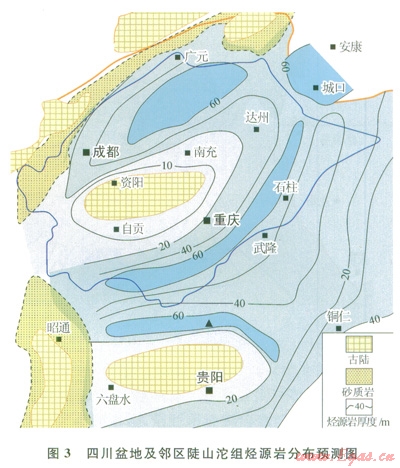 四川盆地腹部?jī)H有少量鉆井鉆遇該層系,且厚度薄,因而這套烴源巖在盆地分布往往不被看好。近期,筆者根據(jù)盆地區(qū)域地震的層位解釋,發(fā)現(xiàn)燈影組底界以下的反射層具有向古隆起超覆沉積的特征,層位應(yīng)歸屬陡山沱組。這表明陡山沱沉積期,上揚(yáng)子地區(qū)存在兩個(gè)同沉積期古隆起,分別是黔中隆起和樂(lè)山—龍女寺古隆起陡山沱組烴源巖在古坳陷區(qū)厚度較大,而隆起區(qū)厚度明顯減薄。圖3是筆者根據(jù)地震解釋結(jié)合露頭剖而資料推測(cè)的陡山沱組烴源巖分布圖。從圖3可以看出,資陽(yáng)古隆起兩側(cè)的川西、川東地區(qū)均存在陡山沱組烴源巖,厚度在20~60m。這一認(rèn)識(shí)大大提升了震旦系含油氣系統(tǒng)的資源潛力。