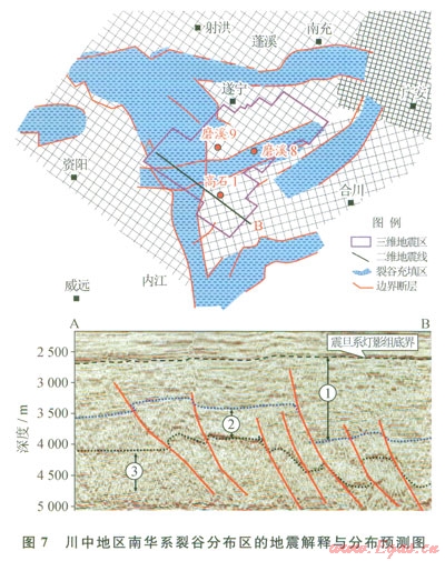 根據(jù)對(duì)川中地區(qū)震旦系燈影組以下層位的地震反射特征解釋,可以進(jìn)一步識(shí)別出裂谷形態(tài)及分布特征。圖7可以看出在南充—遂寧之間、磨溪地區(qū)存在近東西向裂谷,而高石梯以西存在近南北向裂谷。根據(jù)3D地震反射特征,可以將裂谷區(qū)充填地層劃分為3的反射層組(圖7)。①反射層組為較連續(xù)反射,成層性好,厚度變化較大,地震反射時(shí)間介于600~1300ms;②反射層組為斷續(xù)反射,底界反射波組連續(xù)性較強(qiáng),可能是某個(gè)地層界面的反射特征;③反射層組為雜亂反射。從解釋的斷裂來(lái)看,既有正斷層也有逆斷層,反映裂谷區(qū)經(jīng)歷了復(fù)雜的構(gòu)造演化歷史。當(dāng)然,區(qū)內(nèi)的地震解釋方案尚沒(méi)有得到鉆井證實(shí),有待進(jìn)一步深化研究。