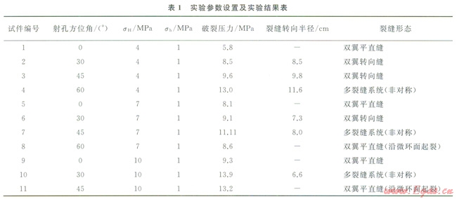 在定向射孔方位角由小變大的過(guò)程中,發(fā)現(xiàn)存在一個(gè)臨界角度,此時(shí),定向射孔處和最大水平地應(yīng)力方向處的第一主應(yīng)力的大小相等,裂縫可能會(huì)同時(shí)在這兩個(gè)位置起裂[1,3]。實(shí)驗(yàn)表明:在試件4、試件7和試件10中產(chǎn)生了非對(duì)稱多裂縫系統(tǒng),井眼一側(cè)是一條沿定向射孑乙起裂的轉(zhuǎn)向裂縫和一條白射孔孔眼根部與井壁的交匯處起裂、穿透水泥環(huán)一段距離后沿sH方向與井壁的交匯處起裂、延伸的單翼平直裂縫,井眼的另一側(cè)是沿定向射孔起裂的轉(zhuǎn)向裂縫(圖3)。而且在地應(yīng)力狀態(tài)一定的情況下,隨著定向射孔方位角的增大,由于水力裂縫的起裂困難和彎曲,產(chǎn)生人工水力裂縫所需的破裂壓力逐漸變大、水力裂縫的轉(zhuǎn)向半徑也越來(lái)越大;在產(chǎn)生非對(duì)稱多裂縫時(shí),破裂壓力和裂縫轉(zhuǎn)向半徑均達(dá)到實(shí)驗(yàn)的最大值(表1)。