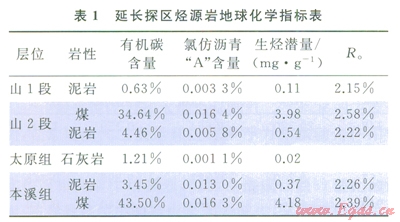 延長探區(qū)上古生界烴源巖為海陸交互相暗色泥巖、煤層及生物屑灰?guī)r,層位主要分布于下二疊統(tǒng)山西組、中石炭統(tǒng)本溪組和上石炭統(tǒng)太原組,平面分布穩(wěn)定,其中山西組泥巖厚度介于70~80m,煤層厚度介于l~7m,主要分布于山2段;太原組石灰?guī)r厚度介于10~40m,本溪組泥巖厚度介于l5~35m,煤層厚度介于1~6m。從地球化學指標來看(表1),山l段泥巖生烴條件較差,平均有機碳含量僅為0.63%,山2段和本溪組較好,其泥巖有機碳含量大于3%,煤層有機碳含量大于30%;太原組石灰?guī)r有機碳含量為1.21%,氯仿瀝青“A”含量和生烴潛量指標均較低。上述情況表明:該區(qū)主力烴源巖為山2段和本溪組暗色泥巖及含煤層系。該區(qū)上占生界烴源巖鏡質體反射率(R。)為1.59%~2.65%,普遍超過2%,處于過成熟干氣階段,生烴強度在28×108~40×108m3/km2。生烴量大,氣源充足,具有“廣覆式”生烴特征[3-9]。