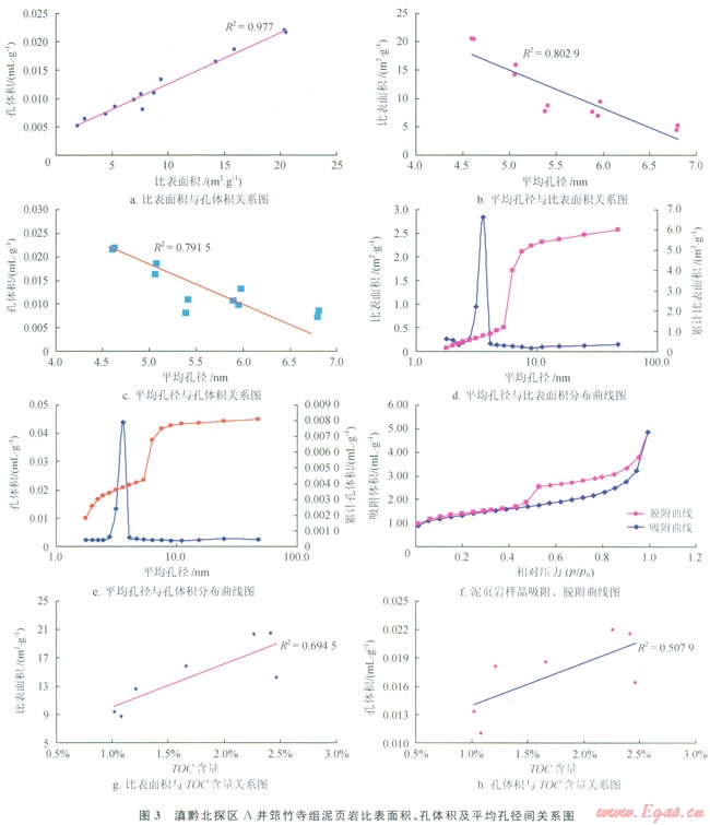 對(duì)滇黔北A井筇竹寺組泥頁(yè)巖樣品進(jìn)行了比表面積測(cè)量和孔徑在1.5~300.0nm樣品的孔體積測(cè)試,得出筇竹寺組頁(yè)巖氣儲(chǔ)層的比表面積為1.915~7.691m2/g.平均為5.185m2/g;孔體積為0.0051~0.0108mL/g,平均為0.0080mL/g;平均孔徑為5.38~10.85nm。反映筇竹寺組泥頁(yè)巖的比表面積和孔體積均較大。有利于頁(yè)巖氣的吸附。從中也可以看出,其孔比表而積與孔體積二者之間具有較好的正相關(guān)性,即隨著比表面積的增大??左w積也隨之增大(圖3-a、3-b)。與之相反。比表面積、孔體積與平均孔徑則呈負(fù)相關(guān)性。即比表面積、孔體積均隨孔徑的增大而減小(圖3-c、3-d).且當(dāng)孔徑小于10nm時(shí),孔體積分布曲線很陡,而當(dāng)孔徑大于等于10nm時(shí),曲線則逐漸變得平緩,說(shuō)明孔徑范圍在1~8nm內(nèi)的孔隙對(duì)泥頁(yè)巖比表而積、孔體積值的貢獻(xiàn)最大(圖3-c),即小孔隙越發(fā)育,頁(yè)巖的比表面積、孔體積越大,越有利于泥頁(yè)巖對(duì)頁(yè)巖氣的吸附聚集。