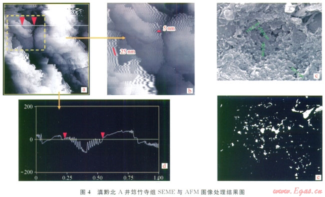 通過(guò)將A井筇竹寺組具有代表性的頁(yè)巖巖心拋光樣品進(jìn)行AFM和SEME圖像處理與分析,將圖像數(shù)據(jù)導(dǎo)入ArcGIS平臺(tái)中進(jìn)行柵格重分類分析,圖像中白色區(qū)域?yàn)榭紫痘蛄严斗植紖^(qū)(圖4-d、4-c)。由此計(jì)算出不同樣品中微觀孔隙的孔隙數(shù)量及其面孔率(表1)。與龍馬溪組頁(yè)巖相比,筇竹寺組頁(yè)巖具有微觀孔隙數(shù)量多、孔徑小、單孔面積小、而孔率大的特征。由AFM剖面圖清晰地顯示出,規(guī)則排列的柵格間為納米級(jí)孔隙,具有鋸齒狀緊密排列的結(jié)構(gòu)特征(圖4-a、4-c),這種規(guī)則的呈明暗相間的柵格狀表面形態(tài)特征可能是頁(yè)巖中干酪根大分子團(tuán)緊密排列的結(jié)果[27-28]。